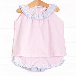 Such a sweet outfit! Fit is TTS and quality is great. Dropped one star because the neckline is quite big—we have to button all the buttons and it still droops down on our guy.