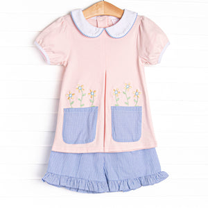 I love this dress I bought for my granddaughter! It has the softest pastel colors, and the pockets area huge hit- perfect spot for little girl treasures! The embroidery is nicely done and adds the cutest touch to the dress! Fits true to size!