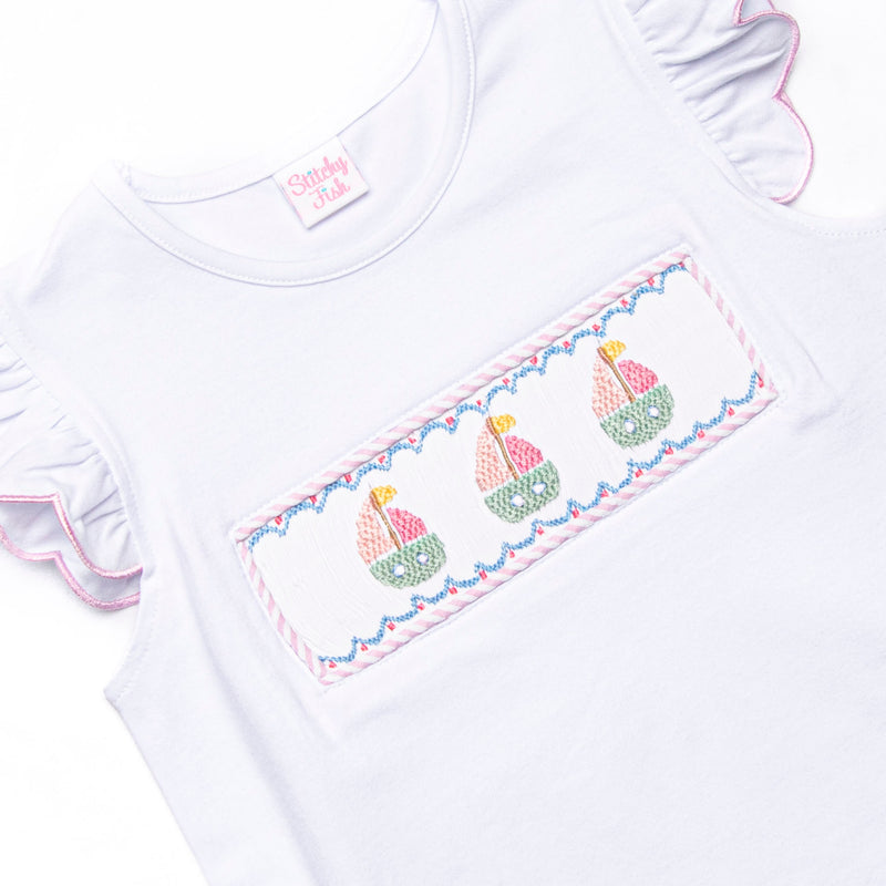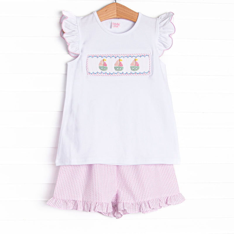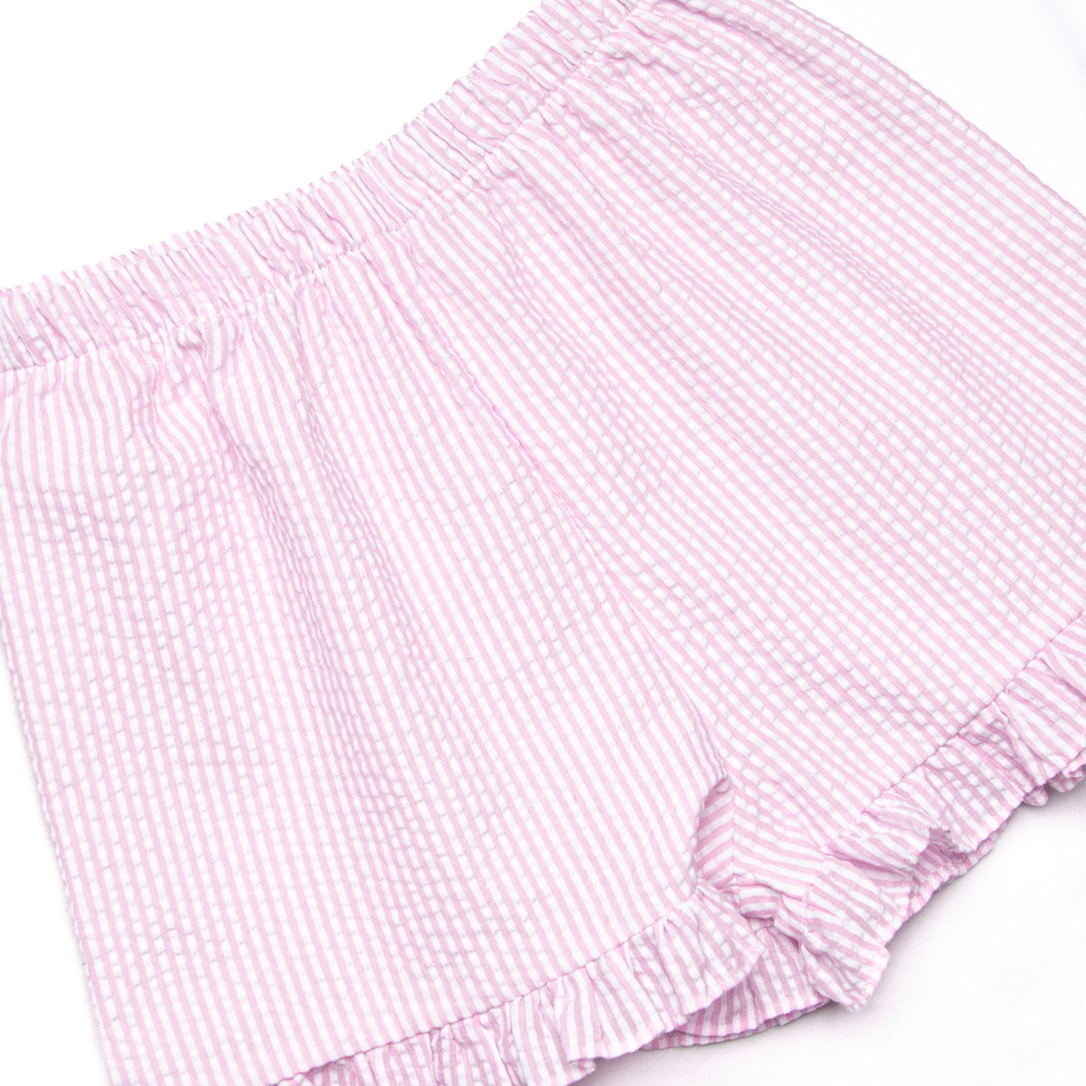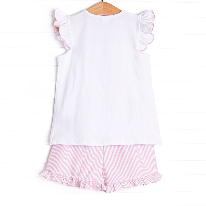 Coastal Cruise Smocked Ruffle Short Set, Pink Seersucker