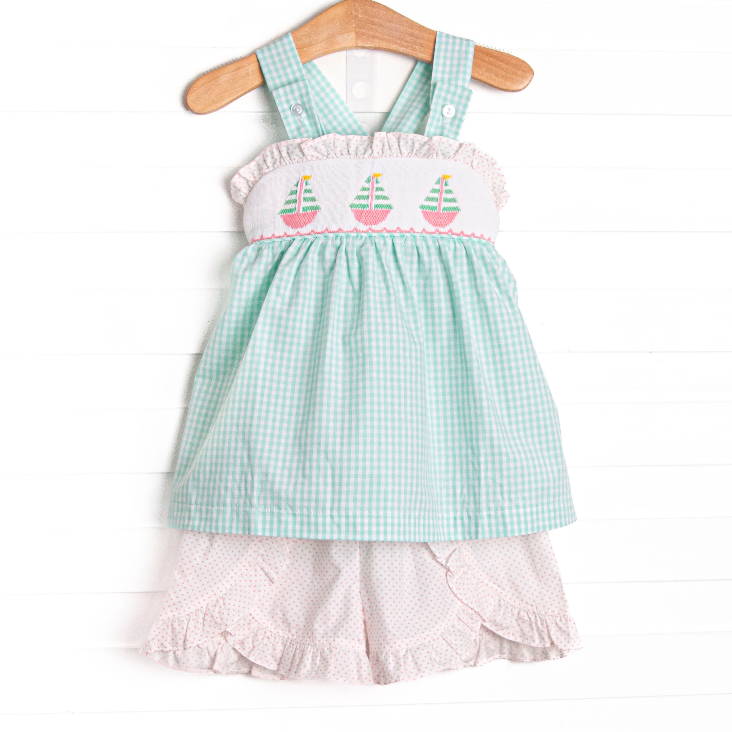 ["12M","18M","24M","2T","3T","4T","5","6","7","8","DV26","GIRL","Girl 2022","Girl 21","Girl 22","Girl Set","Girl21","Girl22","GirlGirls","Girls","Girls 2022","Girls 21","Girls 22","Girls Set","Girls Short Set","Girls22","Green","Green Gingham","march26","mint","mint gingham","Mint Green","New Arrivals","no sleeve","No Sleeves","Pink Ruffle","Pink Ruffle Trim","pink ruffles","Poly","Poly Blend","Polyester","Polyester Blend","Regular Price","Ruffle","Ruffle Short Set","Ruffle Trim","Ruffles","Ruffles Hem","Sail","Sail Boat","Sailboat","Sailboats","sailing","Set","Sets","Sets22","Short Set","shorts set","sleeveless","Smock","Smocked","Smocked Outfit","Smocked Set","smocked short set","smockedco","Smocking","Spring In Stock","Spring In Stock 26","Summer Short Set","Woven Shorts Set"]